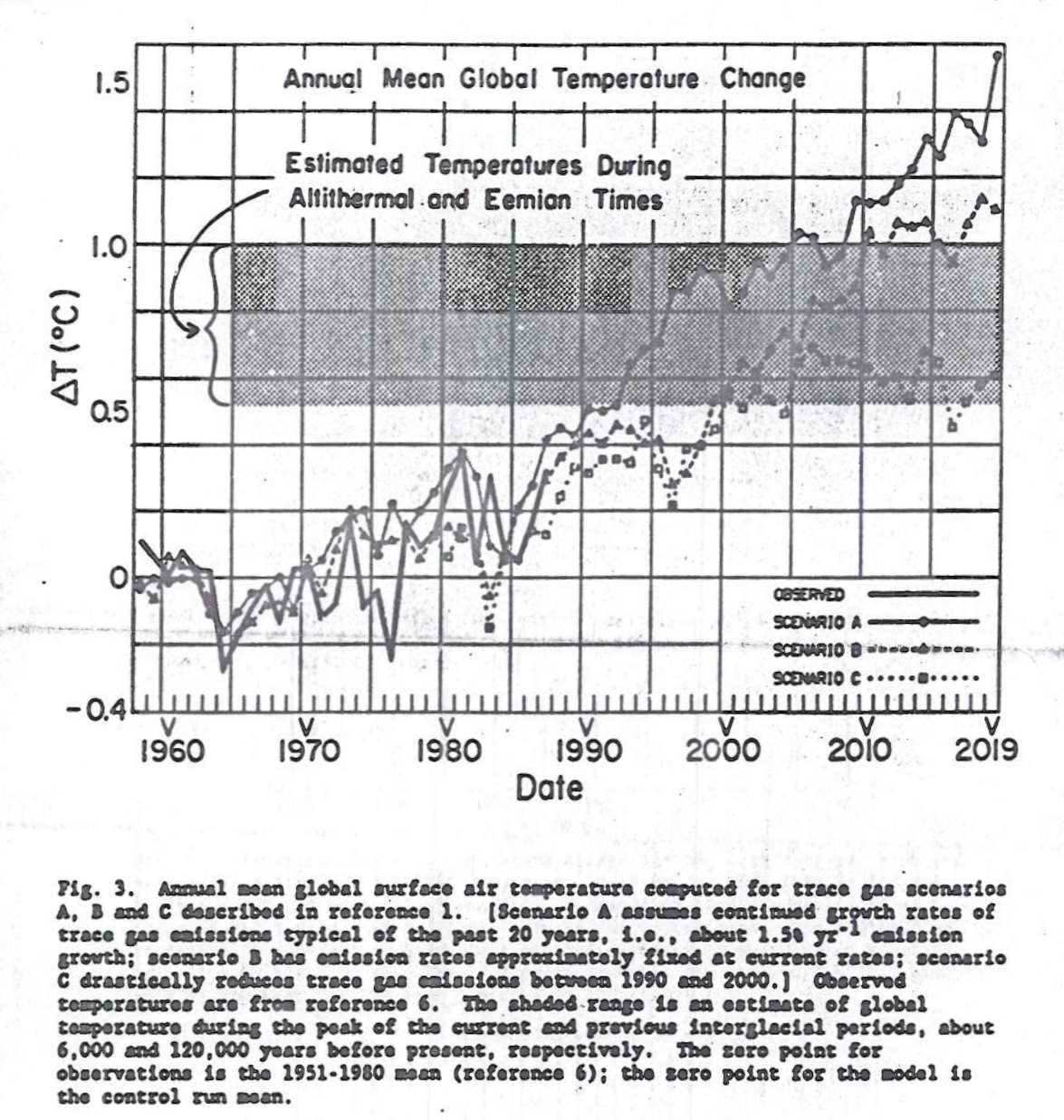 My principal conclusion are: (1) the earth is warmer in 1988 than at any time in the history of instrumental measurements, (2) the global warming is now sufficiently large that we can ascribe with a high degree of confidence a cause and effect relationship to the greenhouse effect, and (3) in our computer climate simulations the greenhouse effect now is already large enough to begin to effect the probability of occurrence of extreme events such as summer heat waves; the model results imply that heat wave/drought occurrences in the Southeast and Midwest United States may be more frequent in the next decade than in climatological (1950 – 1980) statistics.