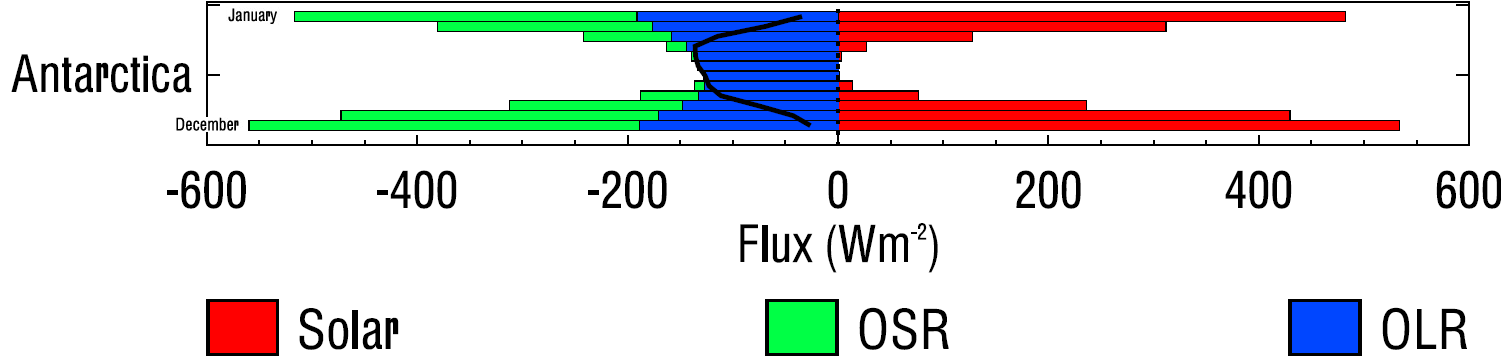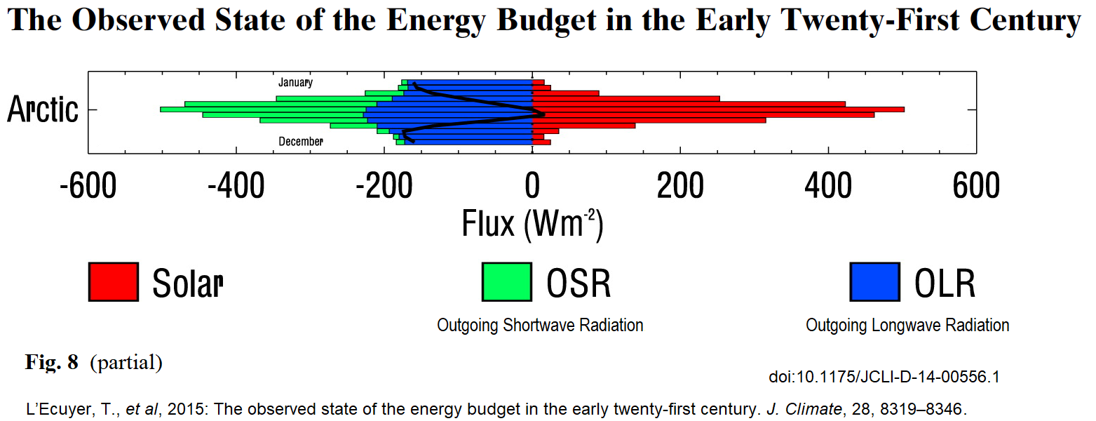 The Arctic Ocean also does so nearly year-round. Solar radiation absorbed in the Arctic only barely exceeds radiative losses, briefly, in early summer.