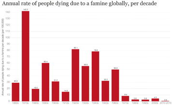 CO2 is “plant food.” Some of you might remember when terrible famines were often in the news, in places like Bangladesh. Famine was one of the great scourges of humanity, the third Horseman of the Apocalypse. The 1918 flu pandemic killed 2% of the world's population, but the global drought & famine of 1876-78 killed 3.7% of world population.