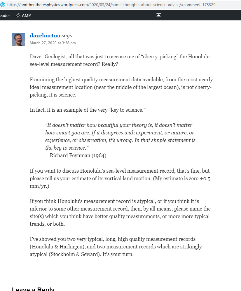 Dave_Geologist, all that was just to accuse me of “cherry-picking” the Honolulu sea-level measurement record? Really?