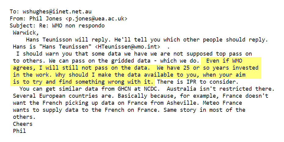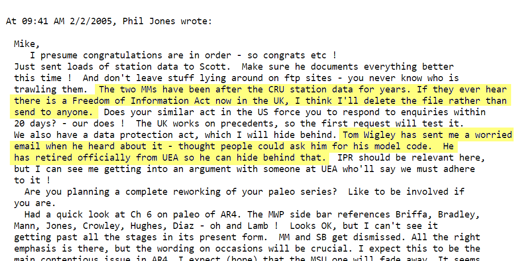 1107454306.txt 2009-01-01 00:00 5.4K For your eyes only ... If McIntyre requests station data under FoIA then Phil Jones will delete it rather than hand it over