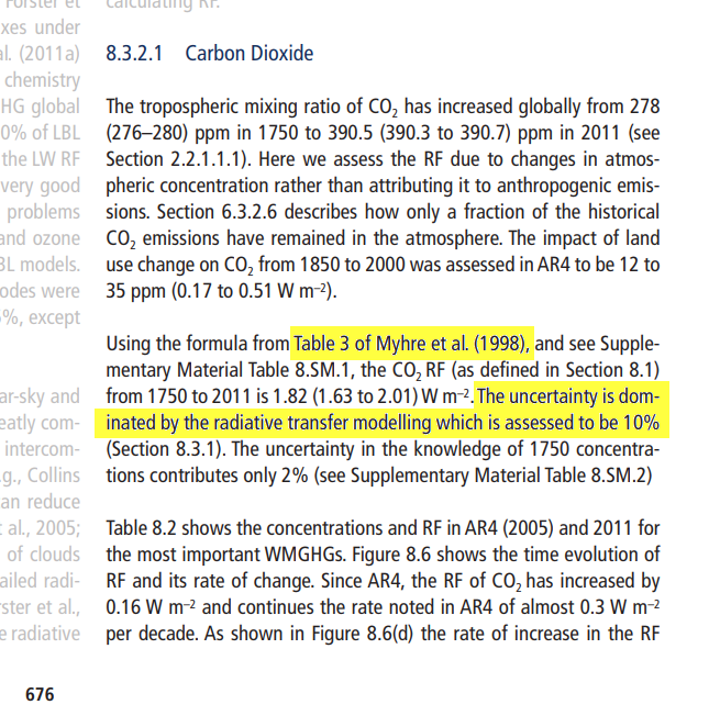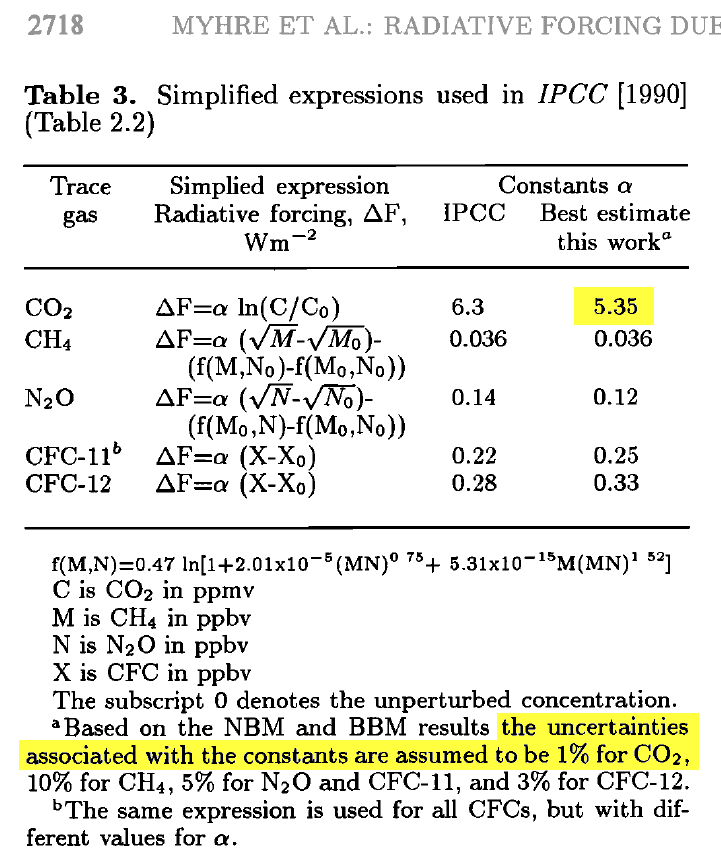 That figure is very close to van Wijngaarden & Happer's “4.28” and Halpern's “4.35”, and closer to Happer's earlier “3.8” than to Myhre's “5.35,” but the uncertainty interval is wide enough to encompass all four estimates. It does preclude the SAR's “6.3” figure.