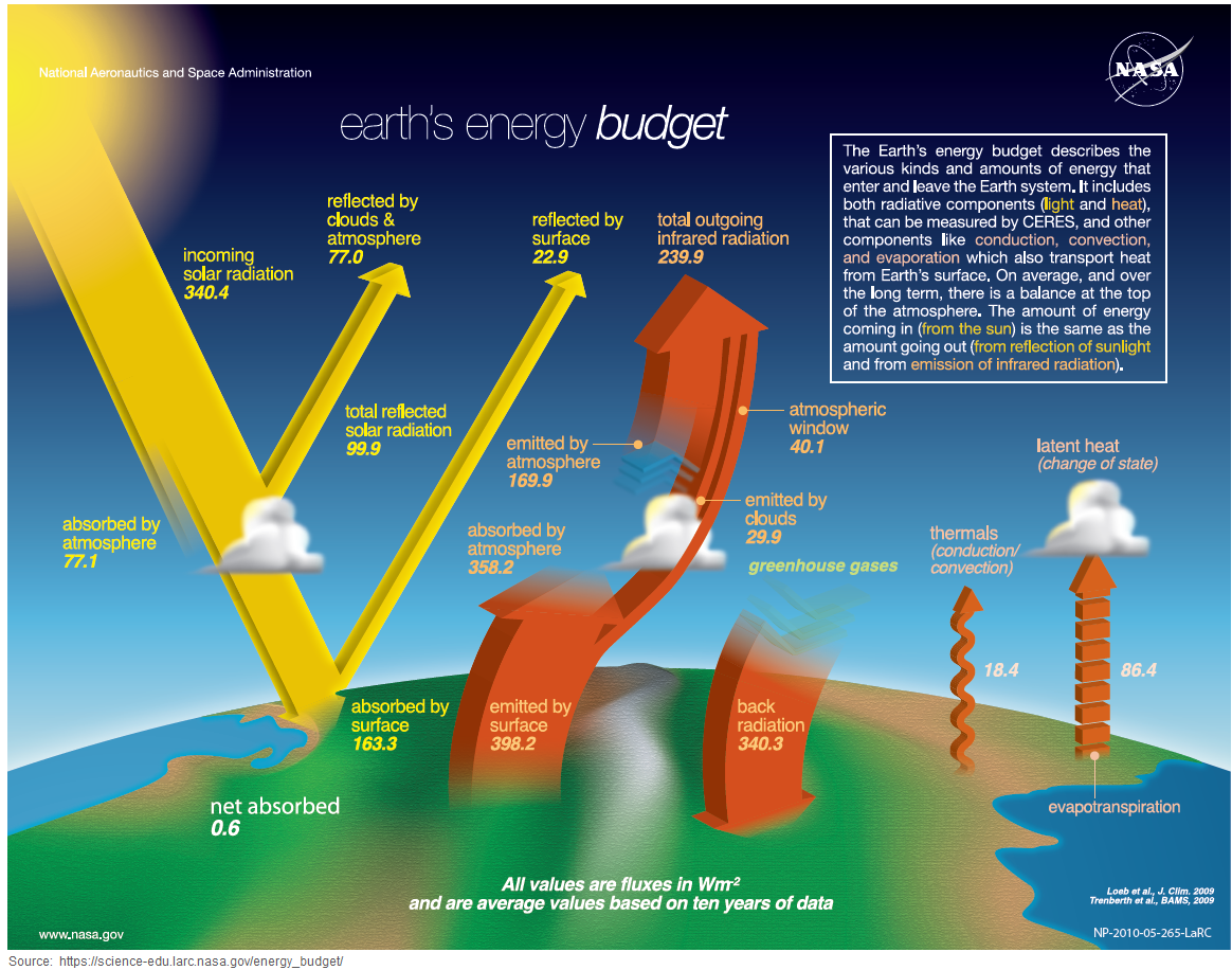 2. NASA's estimate of outgoing radiation at TOA is 239.9 W/m² IR + 77.0 + 22.9 = 339.8 W/m², which is 0.6 W/m² less than the incoming solar radiation. That figure is called the “radiative imbalance.” ↑