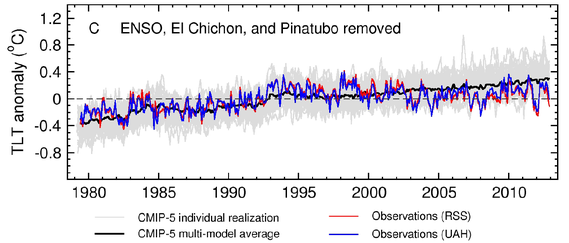 2. The “pause” began around 1993. The measured warming is all in the first 14 years (1979-1993). Their graph (with corrections to compensate for both ENSO and volcanic forcings) shows no noticeable warming since then (1994-2013).