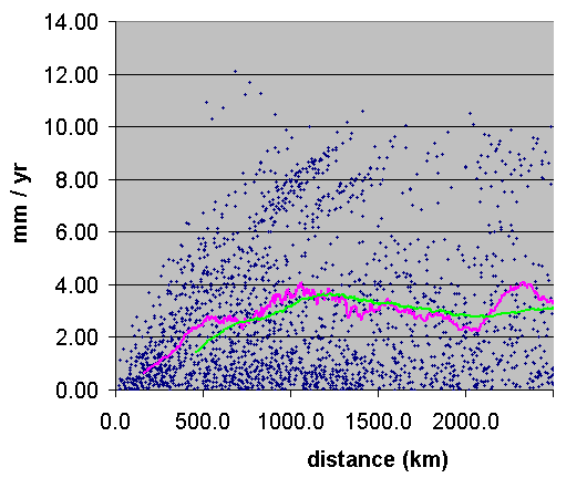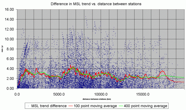 (Aside: From this, one fact seems apparent: 159 tide stations are not really enough to thoroughly sample the world's ocean coastlines, which I guess probably total a few hundred thousand km. To address that problem, I sought a larger list of tide station LMSL trend measurements. I found one here [copied here], with 1113 tide stations. Unfortunately, when I repeated the previous exercise with this data, the result (or here) didn't appear to show any greater correlation at all between LMSL trends at nearby tide stations. I suspect that was because of the poor quality of the data for many tide stations, which had been in operation only a few years, and the fact that many of the comparisons were between tide stations which had been operating during different time periods. It seems that the GLOSS-LTT stations are the cream of the crop, with the best available data.)