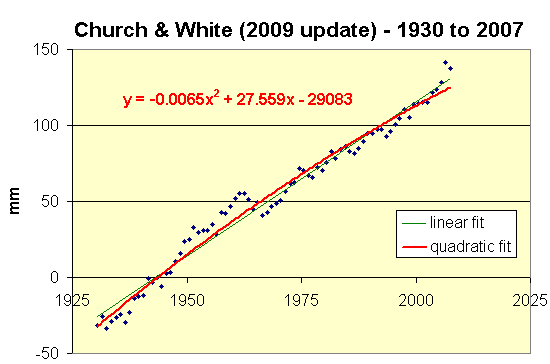 Using their original data yields a deceleration of 0.007 mm/yr² for 1930 to 2001, and their latest data yields a deceleration of 0.013 mm/yr² for 1930 to 2007 – coincidentally the exact same magnitude (but opposite sign) as the 1870-2001 acceleration which they called “an important confirmation of climate change simulations.”