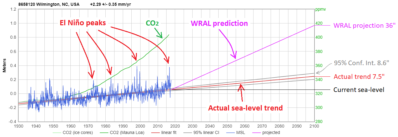 Here's NC's longest, highest-quality sea-level record (Wilmington), plus the WRAL prediction. Wilmington is NC's only GLOSS LTT tide gauge. Sea-level there has been rising at about 2.3 mm/year for the last 82 years.