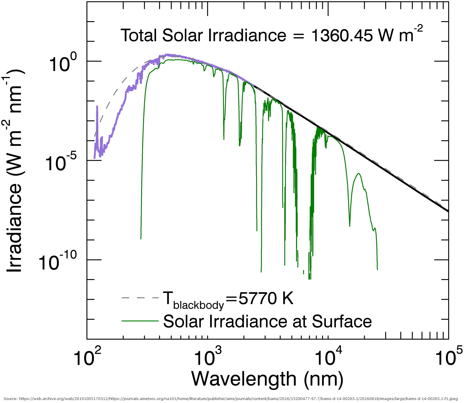 - Total Solar Irradiance (TSI) is the average intensity of solar radiation at Earth's TOA, a/k/a the Solar Constant. Estimates of its value, from satellite measurements (1979-present), are in the range of 1360 to 1373 W/m²[1][2][3][4][5][6][7][8], with recent estimates converging on 1360 to 1362 W/m². See also solar contant, radiative forcing, ERB, ACRIM & SORCE. (The average irradiance over the entire Earth is 1/4 of TSI, because the surface area of a sphere is 4× the area of a circle of same radius, so if the solar constant is taken as 1362 ±2 W/m² then the average irradiance is 340.5 ±0.5 W/m².) ↑