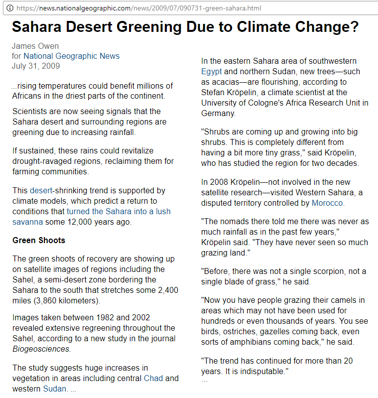 1. Sahara Desert Greening Due to Climate Change?, by James Owen, National Geographic News, July 31, 2009 (or here; was here)