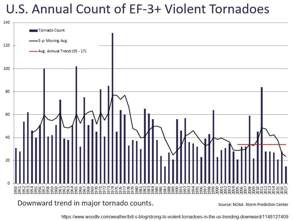 I hesitate to call the slight decline in tropical cyclones a trend, but severe tornadoes are certainly down. Yet Hansen and other prominent climate alarmists still won't admit that a benefit of anthropogenic climate change might be a reduction in extreme weather.
