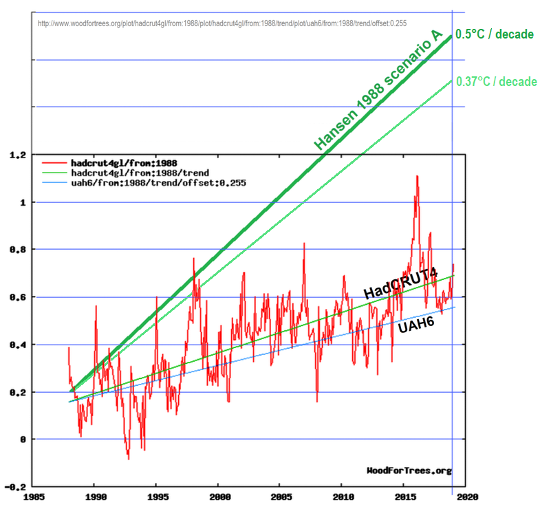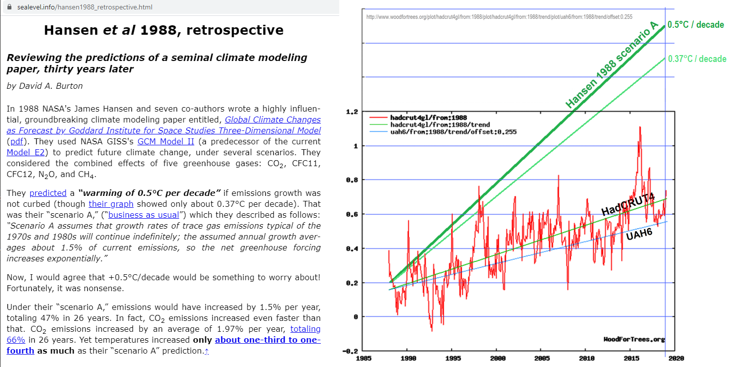 Most scientists are cautious about making predictions which are apt to embarrass them in the future. But Hansen et al 1988 had a purpose. It was the basis for Dr. Hansen's famous June 23, 1988 Congressional testimony. 5½ months after that testimony, and 3½ months after the paper was published, the United Nations created the Intergovernmental Panel on Climate Change, to combat the perceived threat — a threat which turns out to have been much ado about very little.↑