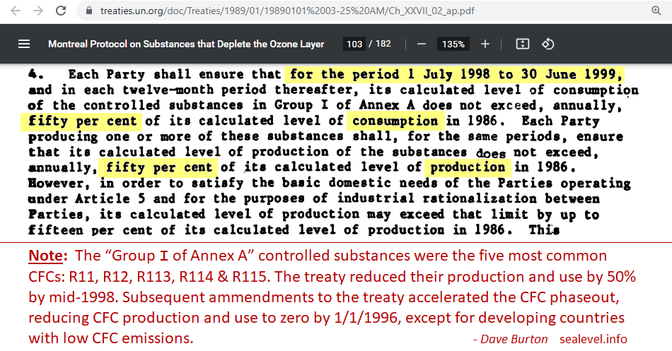 Additionally, including an exponential increase in CFCs in their “business as usual” Scenario A was indefensible, because the Montreal Protocol treaty had already been agreed upon in 1987 (and unanimously ratified by the U.S. Senate earlier in 1988), and the Vienna Convention back in 1985. The original version of the Montreal Protocol mandated a 50% reduction in CFC production and use by mid-1998 (p.103). Subsequent amendments accelerated that, to fully eliminate most CFC production and use by 1/1/1996.↑