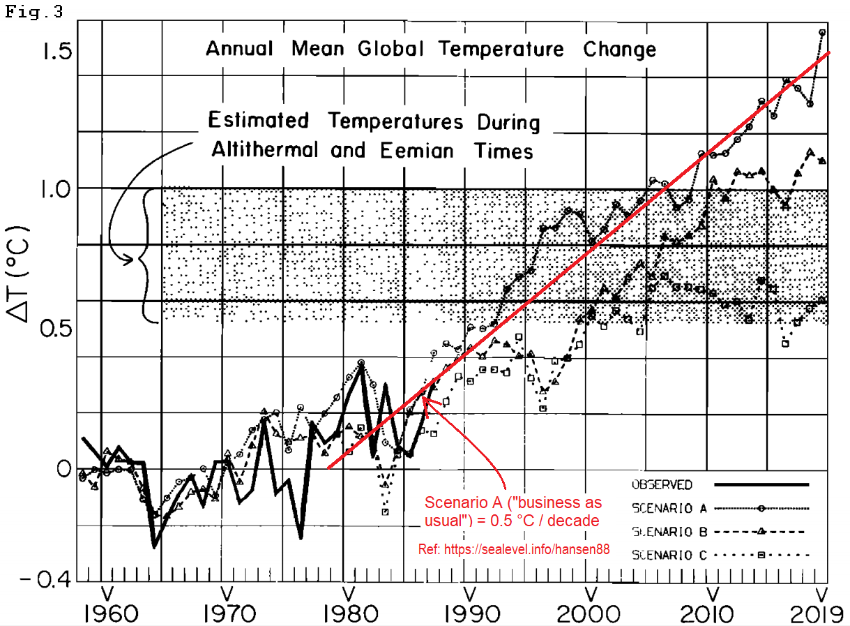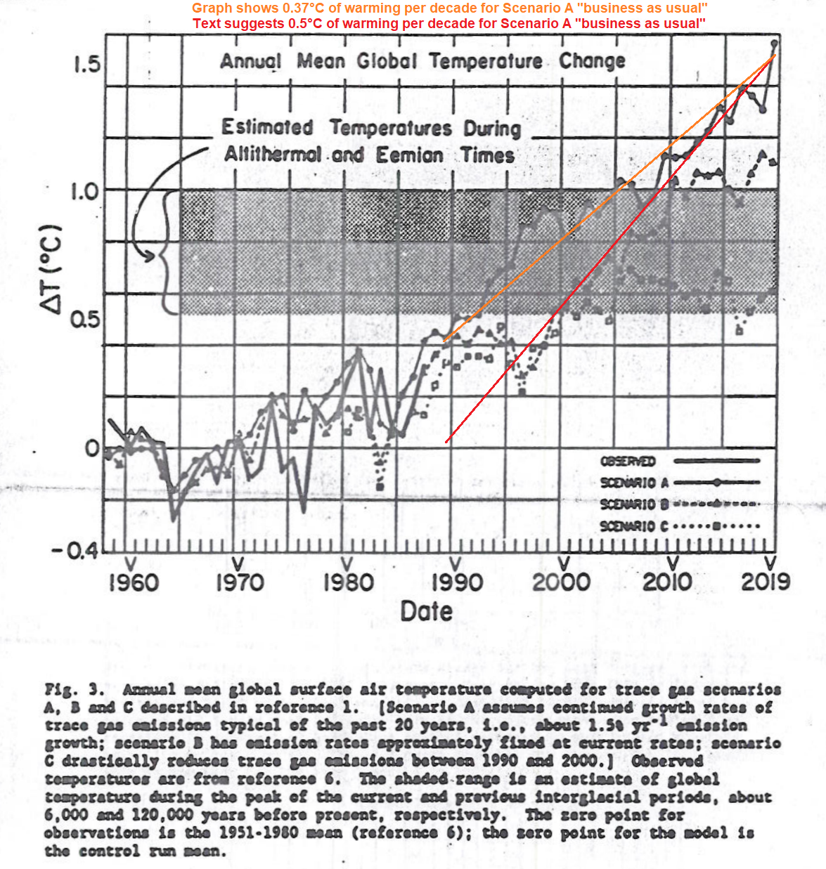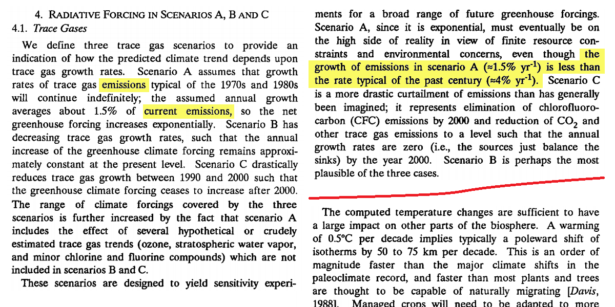 That was their “scenario A,” (“business as usual” [transcripts]) which they described as follows: “Scenario A assumes that growth rates of trace gas emissions typical of the 1970s and 1980s will continue indefinitely; the assumed annual growth averages about 1.5% of current emissions, so the net greenhouse forcing increases exponentially.”