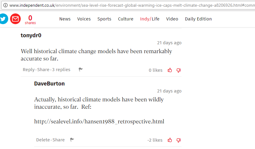 I'm kidding, of course. The same people who say we should trust the current GCMs also uniformly but preposterously insist that the predictions of the older GCMs were pretty good. Here are examples from RC, SkS, and CarbonBrief; all three conflate CO2 levels with CO2 emissions, and then pretend that Hansen's “Scenario B” was the closest to reality. Their refusal to acknowledge the proven predictive failures of older models undermines their credibility w/r/t future predictions from newer models.