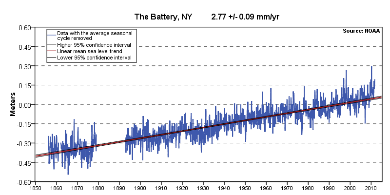 Sea level at The Battery, NYC, showing linear trend since ~1900