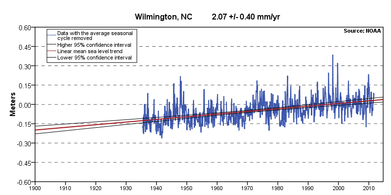 Sea level at Wilmington, NC, USA, showing linear trend