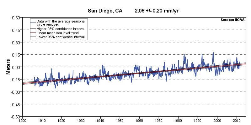 Sea level at San Diego, CA, USA, showing linear trend