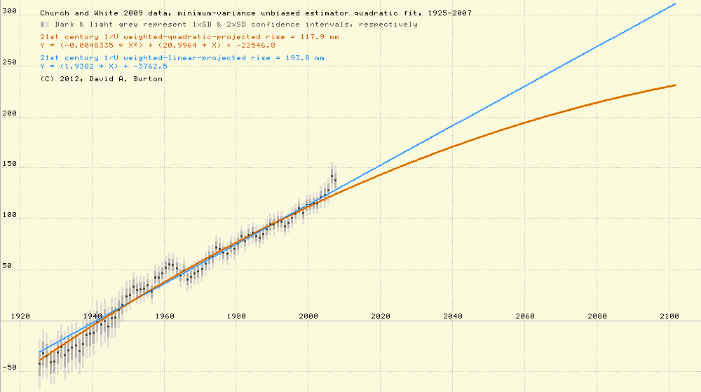Church & White 2009 data, 1925-2007, minimum-variance unbiased estimator quadratic fit