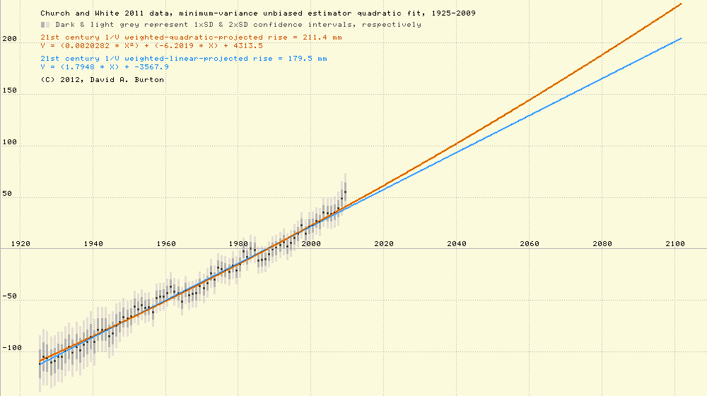 Church & White 2011 data, 1925-2009, minimum-variance unbiased estimator quadratic fit