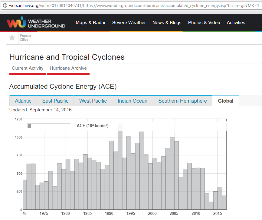 22. Global Tropical Cyclone Accumulated Cyclone Energy graph (ACE), from ClimateAtlas.com/tropical/ (or similar but older graph from wunderground.com).
