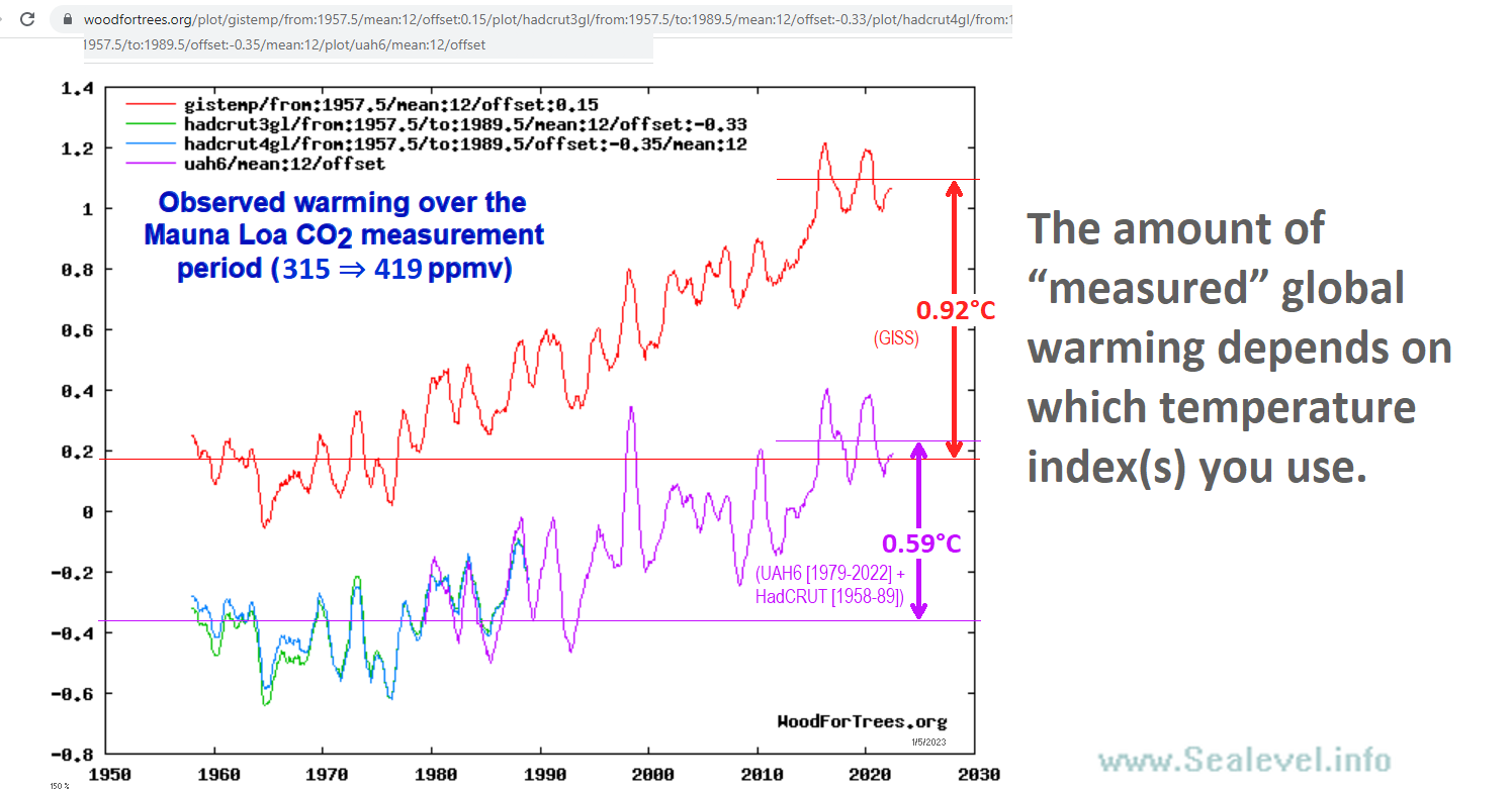 8. The warming effect of CO2 and other so-called “greenhouse gases” is through what is called “radiative forcing.” For an excellent discussion of it I recommend this 2014 UNC Physics Colloquium by Princeton atmospheric physicist Prof. Will Happer.