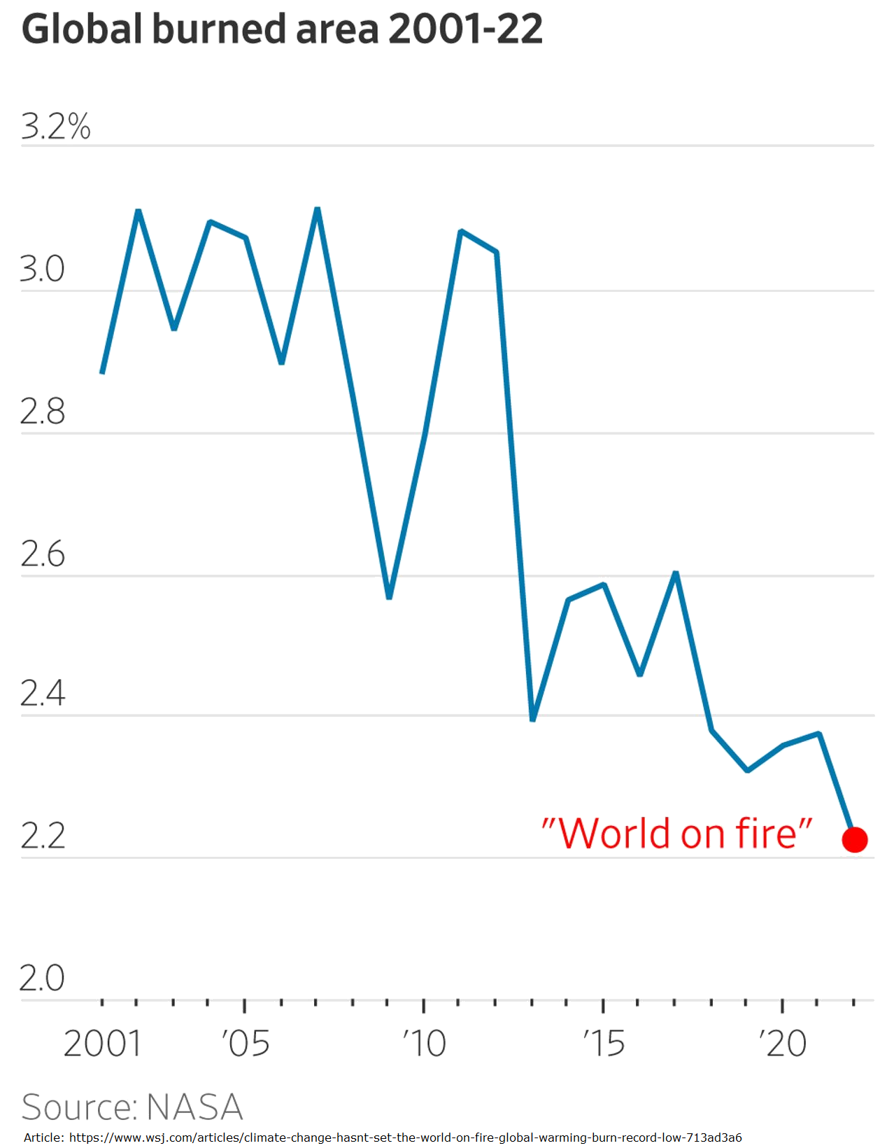 34. NASA satellites monitor fires from orbit, and they've measured a decreasing trend in fires. NASA reports that, “...MODIS [satellite instruments have measured] a decrease in the total number of square kilometers burned each year. Between 2003 and 2019, that number has dropped by roughly 25 percent.” The percentage of the globe which burns each year has been declining since 2002. In 2022, the world hit a new record-low of 2.2% burned area.