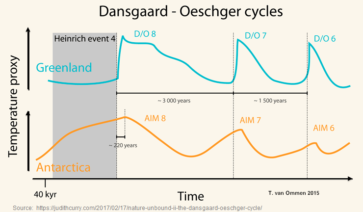 That's a small change, and a very slow rate of change, in comparison with past natural changes in the Earth's temperatures. Dansgaard-Oeschger cycles in northern and southern hemispheres We know from ice core isotope analyses that over the last 100,000 years the Earth has experienced dozens of natural “Dansgaard-Oeschger events” (a/k/a “Greenland interstadials”) in which temperatures changed at rates as rapid as several degrees per decade. (Caveat: The most rapid changes are seen in Greenland ice cores, but Greenland's temperature changes tend, in general, to be at least twice as rapid as globally averaged temperature changes, due to “Arctic amplification.”)