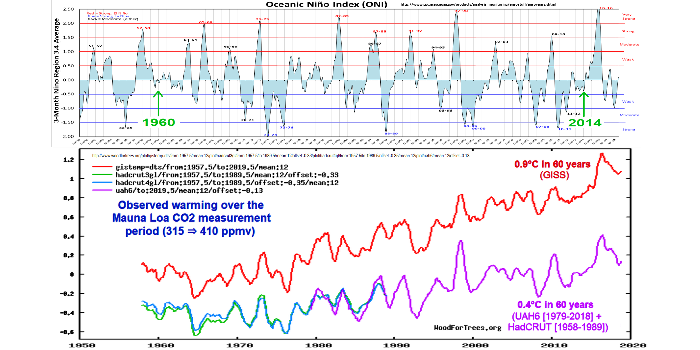 For example, to capture most of the period of rapid CO2 level increases, while avoiding distortions from major ENSO spikes, we could use the period 1960-2014: (click on the graphs to enlarge them)