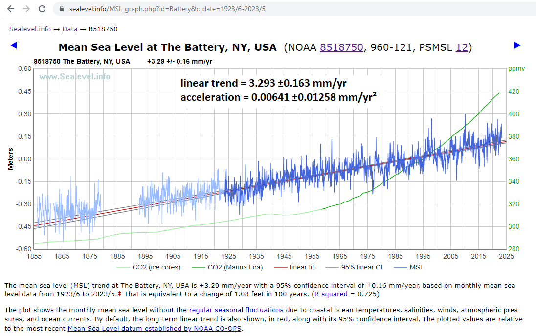 The Battery has 1825 months of sea-level measurements. No other NOAA Atlantic site has that much. Only San Francisco has more, but it has only 1404 months of measurements since the 1906 earthquake. The downside to The Battery's measurement record is its high (atypical) rate of subsidence, which roughly doubles the local ("relative") sea-level trend there.